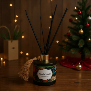 Special edition Christmas room diffuser in a black bottle with a gold tassel, filled with Marula Neroli fragrance; black bamboo sticks set included.