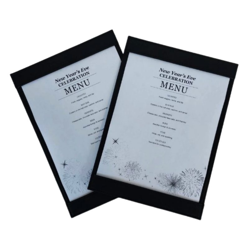 A4 Single Page Menu Holder – Black or Brown Leatherette. Comes in a set of 10.