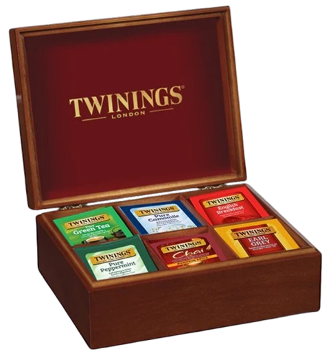 These Twining Tea boxes are made with high quality fine wood and finished with the Queen's Royal golden Warrant and solid brass hinges and openings. (Cannot be stained)